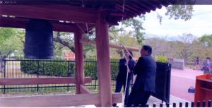 平和の鐘の鐘打では皆さま手を合わせ平和を願って鐘を撞いておられました。最後に泊三夫理事が締めくくりの挨拶をし、記念撮影をして滞りなく式典が終了しました。